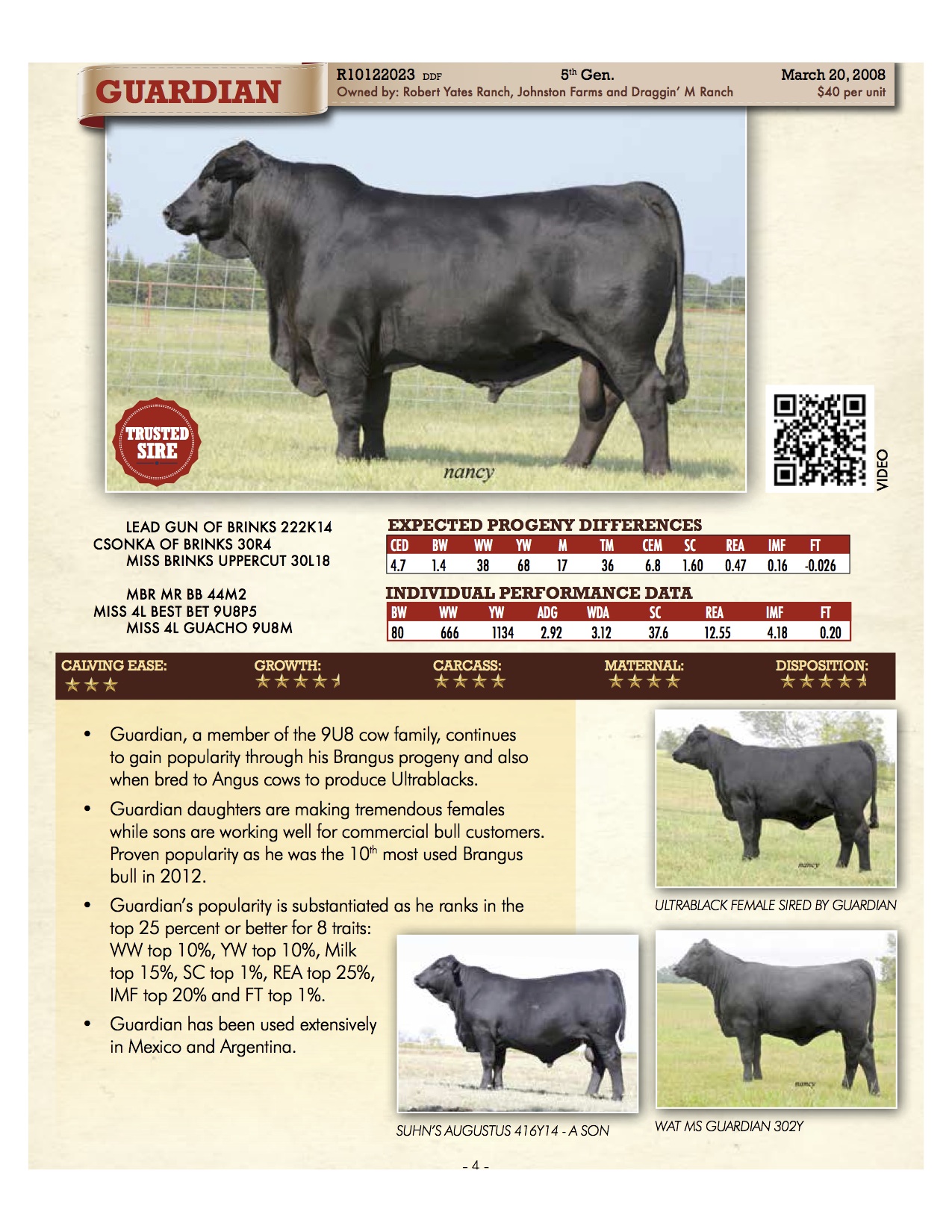 • hijas Guardianes están haciendo tremendo trabajo como hembras madres mientras que los hijos están funcionando muy bien para los clientes comerciales de toros. Probado su popularidad, ya que fue el décimo toro Brangus más utilizado en 2012.